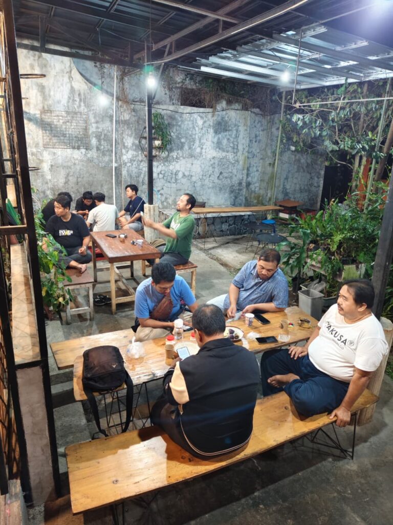 Rabu malam pukul 19.45 aku sampai diparkiran lokasi acara, Pecel Emak Mbing – tampak luar peserta sudah berdatangan dengan obrolan santainya, aku bergegas masuk serasa menyalami peserta lainnya dan langsung tertuju pada kursi yang ada sandarannya di sebelah kanan depan.